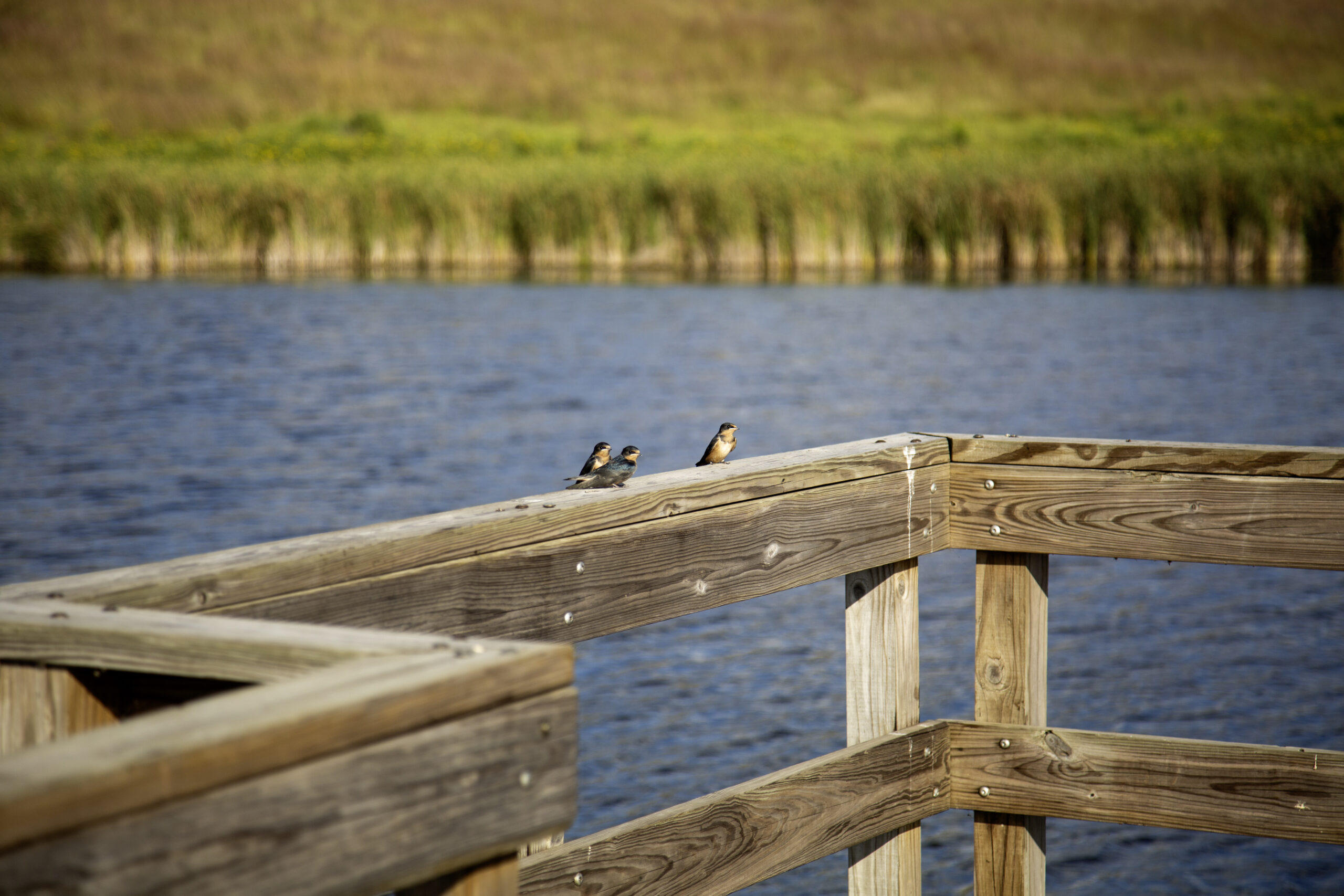 Three barn swallows perched on the floating dock railing at Wolf Lake, Windom wetland conservation area, southwestern Minnesota – a quiet wildlife moment on the prairie wetland.
