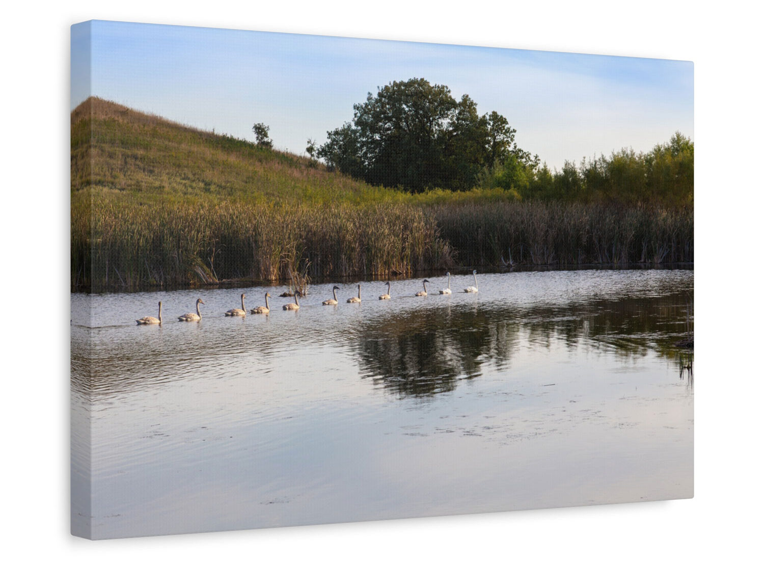 A family of Trumpeter Swans – two adults and nine cygnets – gliding across the calm waters of Wolf Lake at the Windom Wetland Management District in southwestern Minnesota.