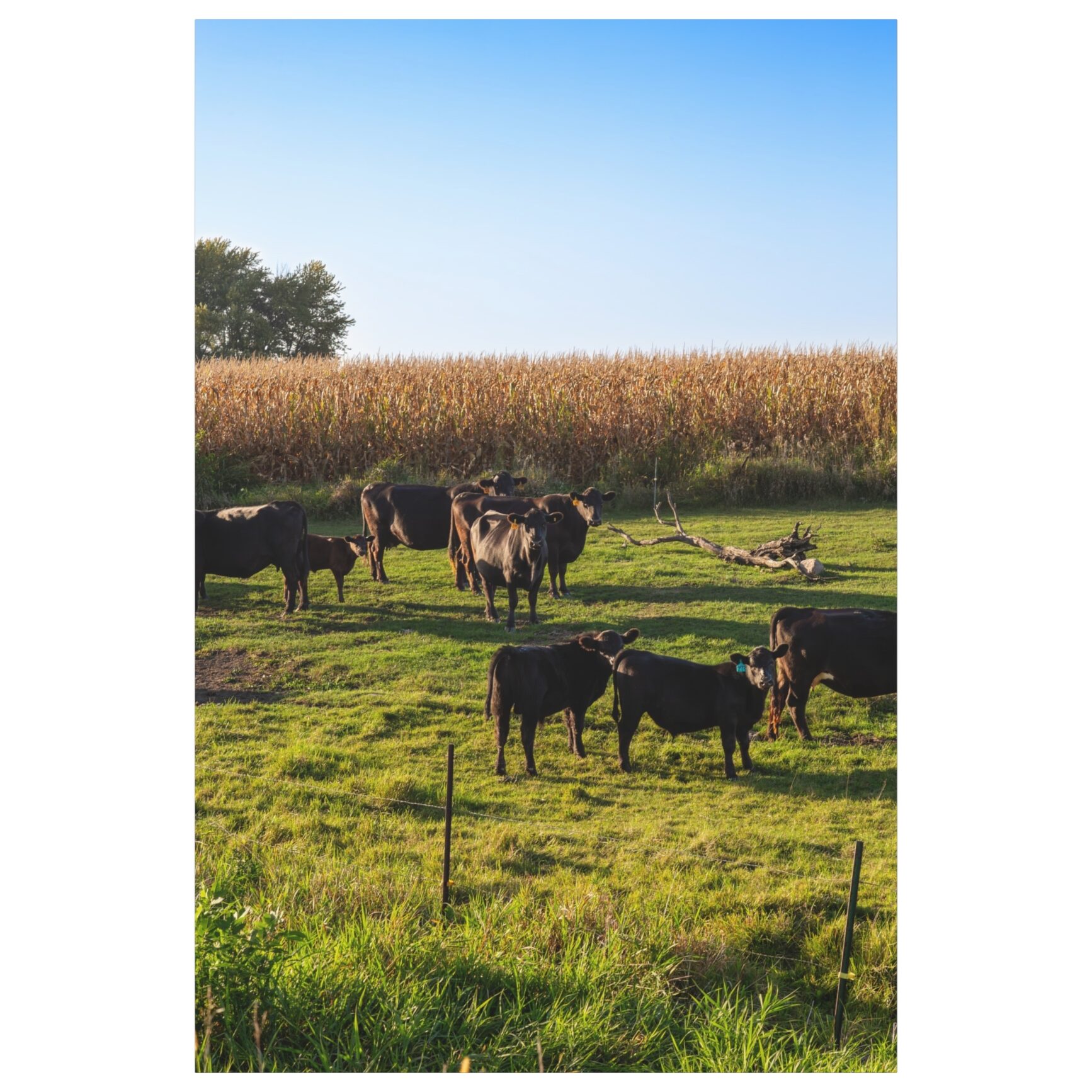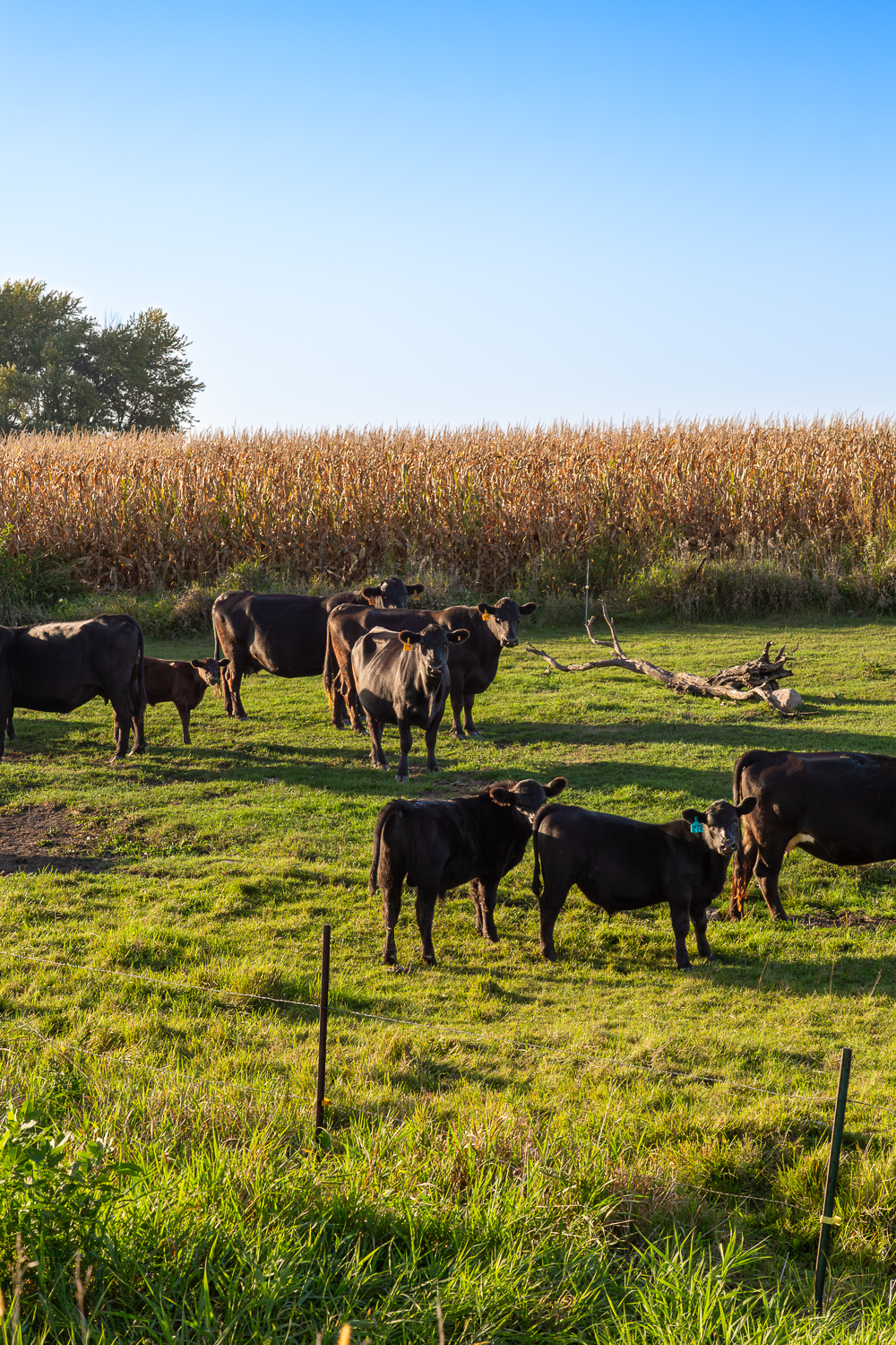 A small herd of Black Angus cattle grazing in a pasture along the rural backroads of Cottonwood County, a mature cornfield ready for harvest just behind them. A few of the younger ones turned to look my way – curious, unhurried, completely at home in the landscape they’ve always known.