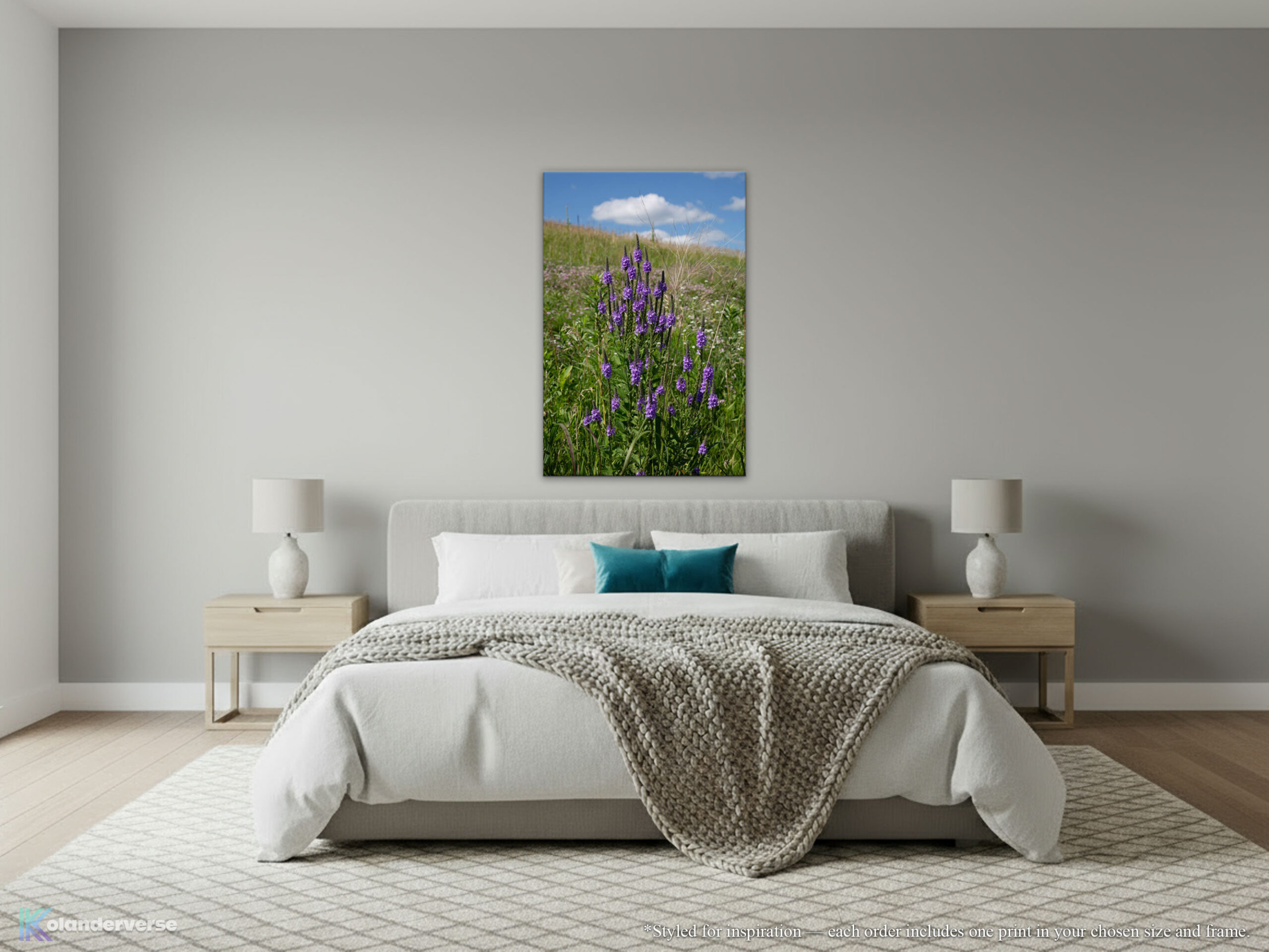 Purple against green against blue – it’s hard to imagine a better color combination, and the prairie delivers it naturally every summer. These Hoary Vervain spires were growing along the trail at Wolf Lake, tall and upright, reaching toward a sky full of summer clouds. The hillside behind them and the open blue sky above give this image a different feel from the other wildflower prints – wider, more open, more like a landscape.