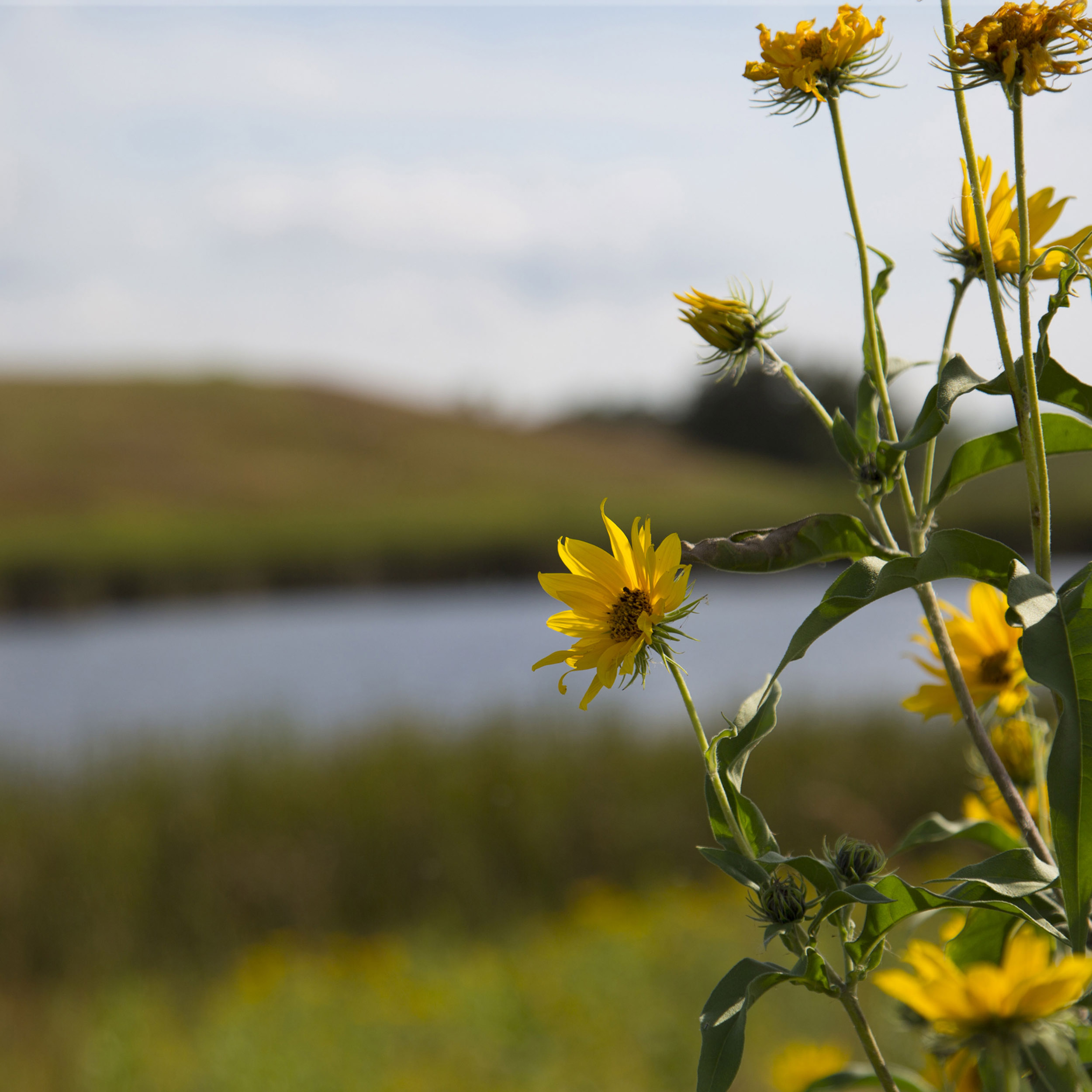 Wild prairie sunflowers growing along the trail at Wolf Lake, with the wetland softly visible in the background – a native wildflower found naturally in the prairies of southwestern Minnesota.