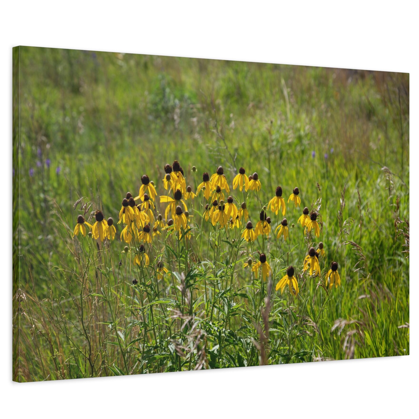 These native wildflowers are often mistaken for their close relative the Black-eyed Susan, but are distinguished by their distinctively drooping yellow petals and tall dark cones. What drew me to this particular group was the color variety in the frame – vivid yellow blooms, hints of purple wildflowers in the background, the warm browns of dried grass, and the lush greens of midsummer all together in one scene.