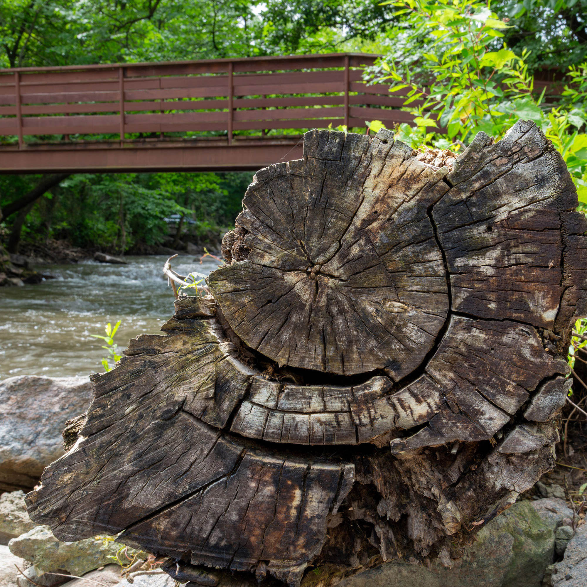 Along the banks of the Redwood River in Ramsey Park, this weathered tree log lies among the rocks with the pedestrian bridge and rushing water visible behind it. The growth rings, cracked and darkened with age, each one a year in the life of a tree that stood here long before.